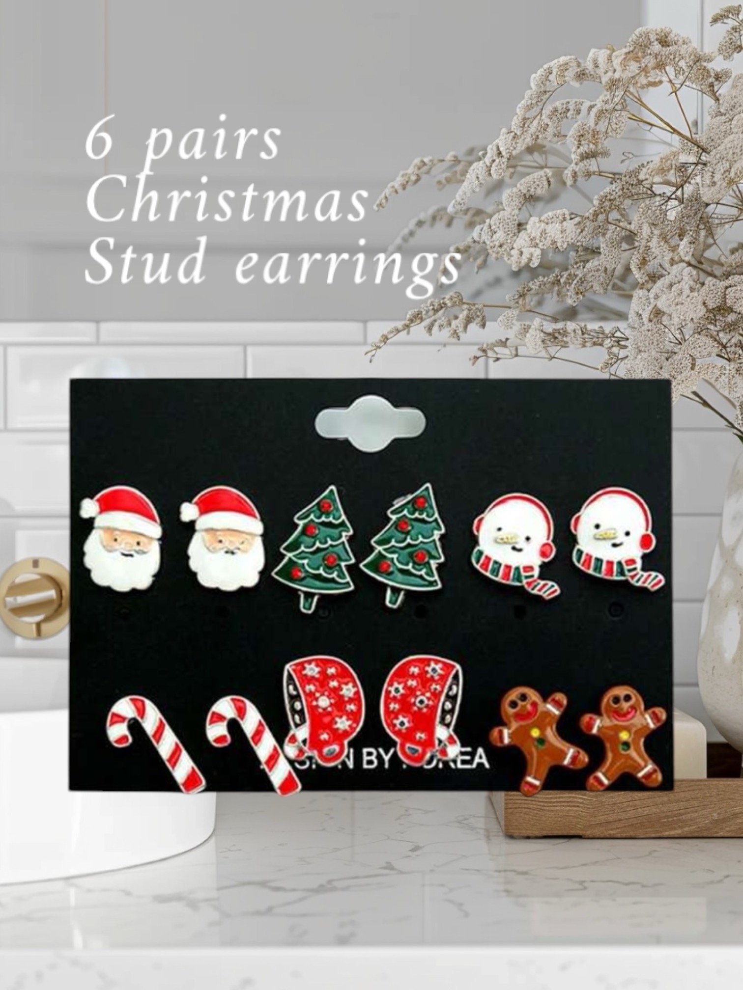 Add a touch of Christmas magic to your look with this charming collection of six pairs of enamel stud earrings, featuring: