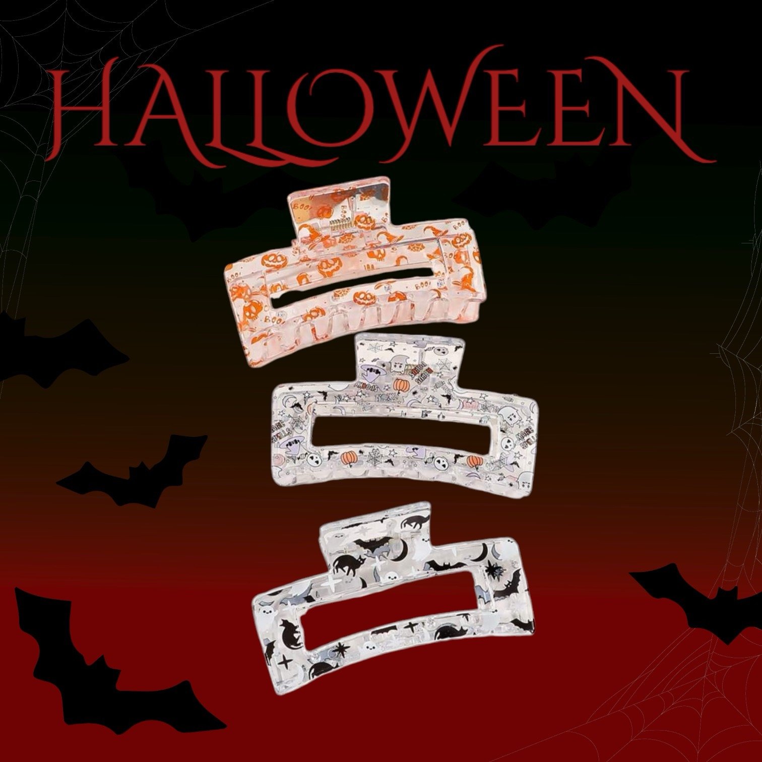 Get into the Halloween spirit with this **3pcs Halloween Pumpkin Ghost Bat Hair Claw Set**, featuring translucent, shiny designs of pumpkins, ghosts, bats, stars, and moons. These medium-sized, hollow hair claws offer both style and function, making them the perfect accessory to add a festive touch to your spooky-season look.