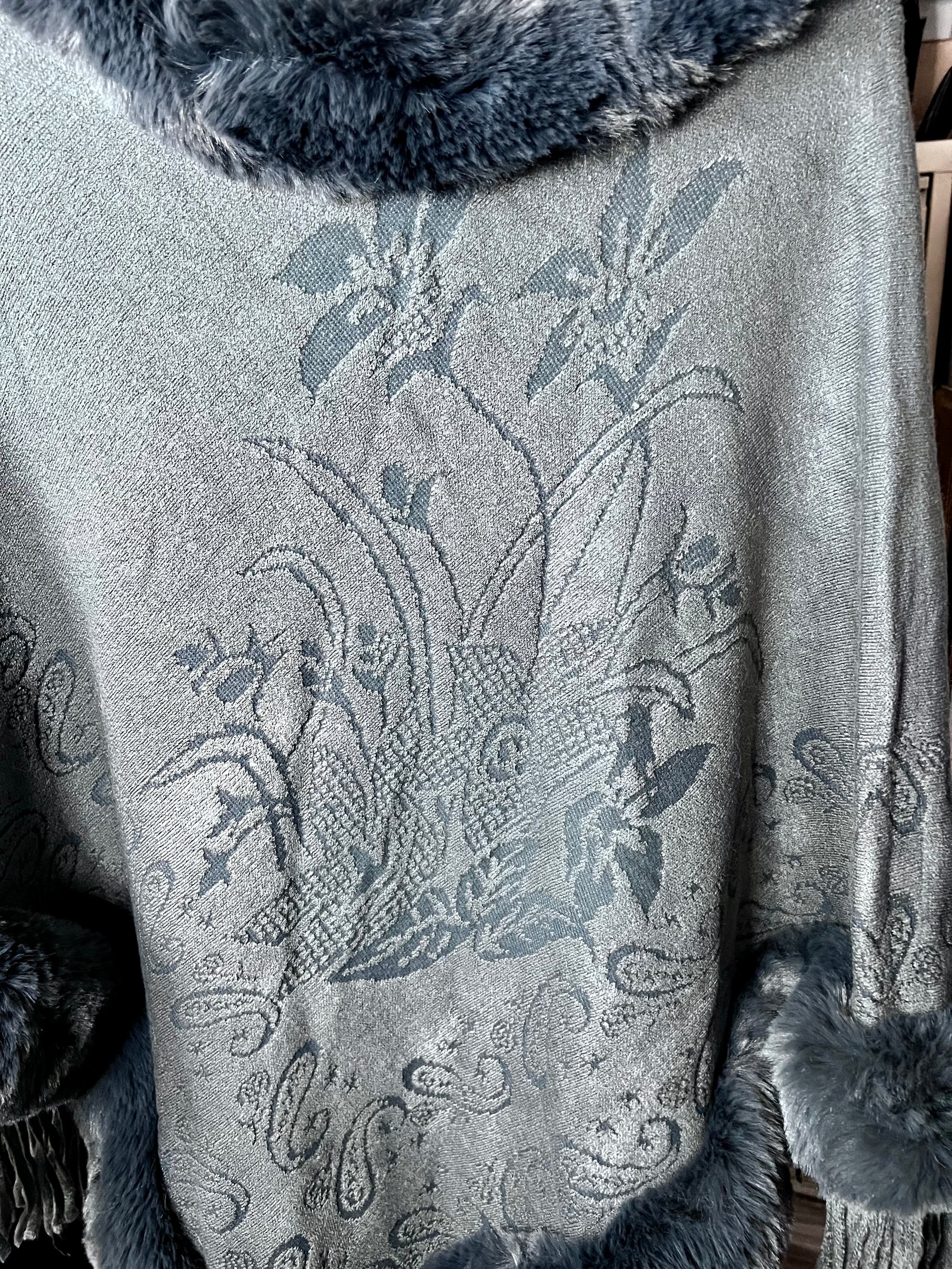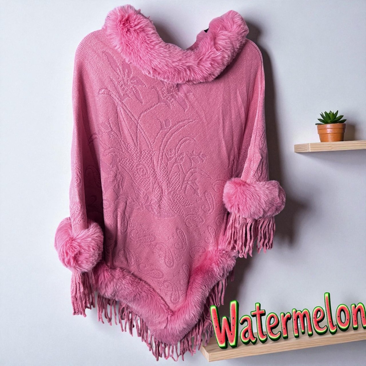 Crafted with a soft jacquard knit and trimmed with ultra-plush faux fur, this poncho drapes beautifully over any outfit. The asymmetrical hem with fringe detailing adds movement and a touch of modern sophistication.